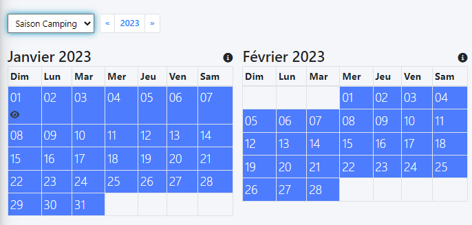 Dates où les séjours sont possibles, c’est un critère important qui permet de définir les périodes d’ouvertures et de fermetures du type d’emplacement sur la réservation en ligne.