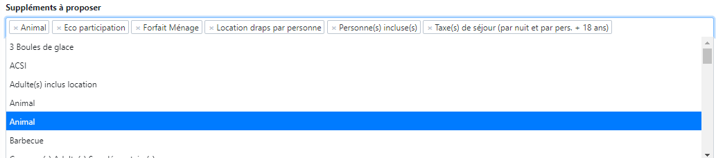 Pour ajouter un supplément au type d’emplacement, vous cliquez dans la zone des suppléments à proposer. Un menu déroulant s’ouvre et vous sélectionnez les suppléments de votre choix.