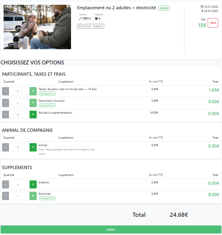 Important : le nombre de personnes ne sera pas modifiable à la prochaine étape. Cela permet de proposer les types d’emplacements en fonction de l’occupation maximum paramétrée et aussi de définir le nombre de taxe de séjour et de suppléments par personnes présentes durant le séjour.