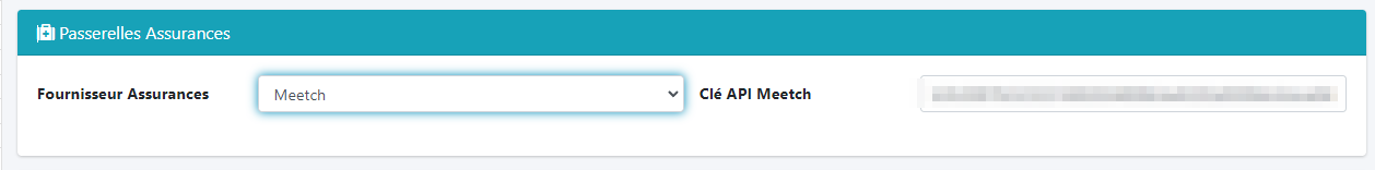 Dans “Paramètres” > “Préférences”, rendez vous dans la section passerelles assurances. Choisissez fournisseur d’assurances Meetch, puis collez la clé.