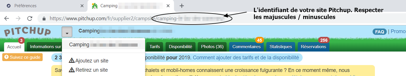 Il s’agit de la dernière portion d’URL qui correspond à votre compte une fois que vous avez sélectionné votre camping dans le menu déroulant après le logo pitchup, sans le dernier slash.