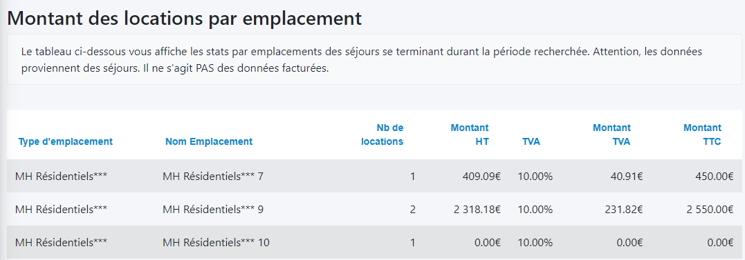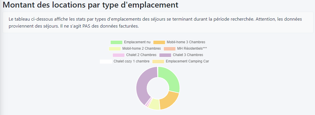 Le tableau ci-dessous vous affiche les stats par emplacements des séjours se terminant durant la période recherchée. Attention, les données proviennent des séjours. Il ne s'agit PAS des données facturées.