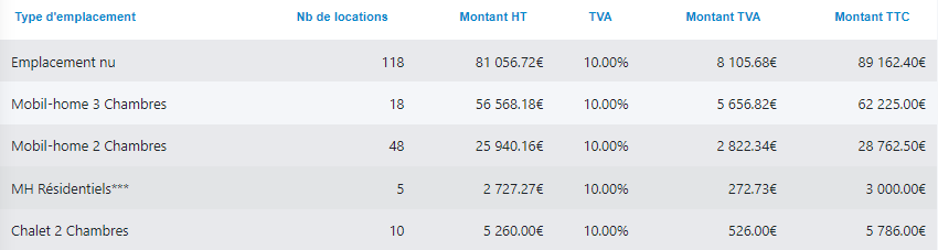 Le tableau ci-dessous affiche les stats par types d'emplacements des séjours se terminant durant la période recherchée. Attention, les données proviennent des séjours. Il ne s'agit PAS des données facturées.