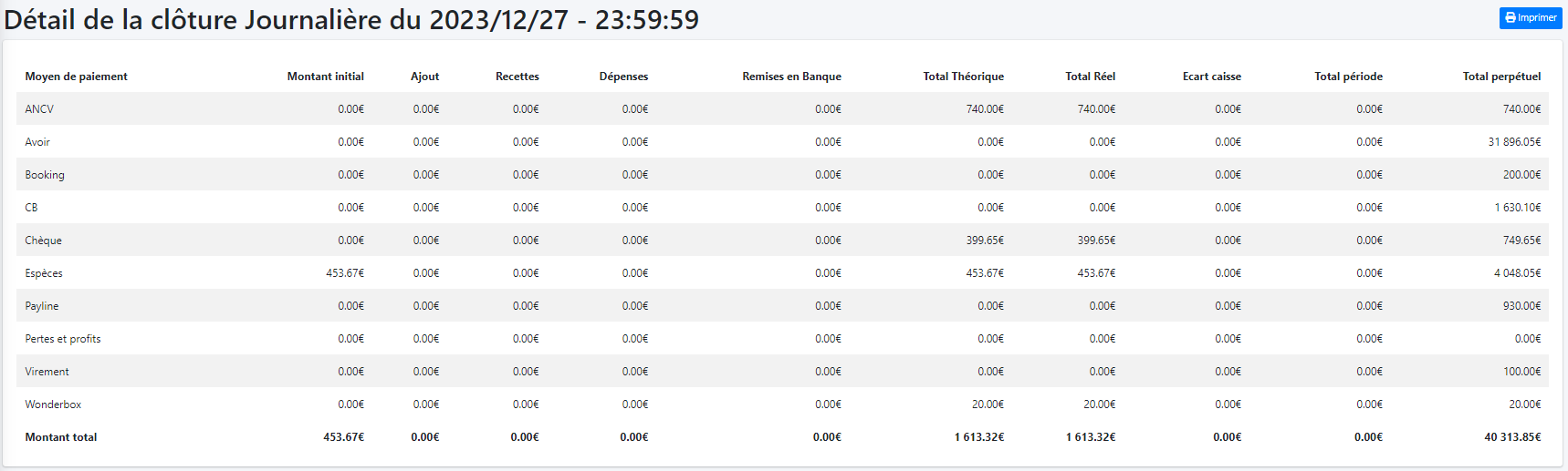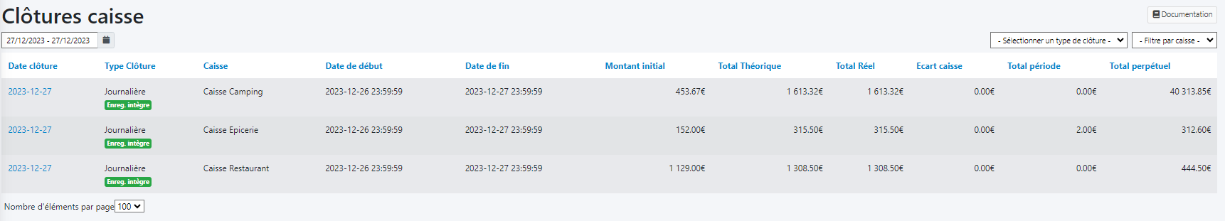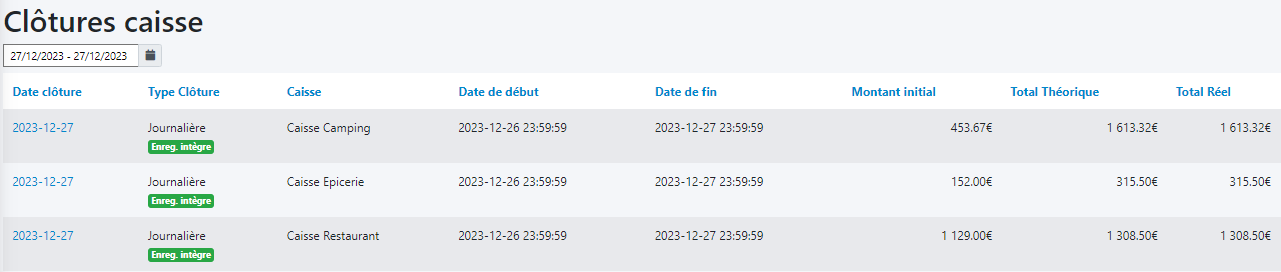 En cliquant sur le lien de date, vous accédez au détail de la clôture journalière.