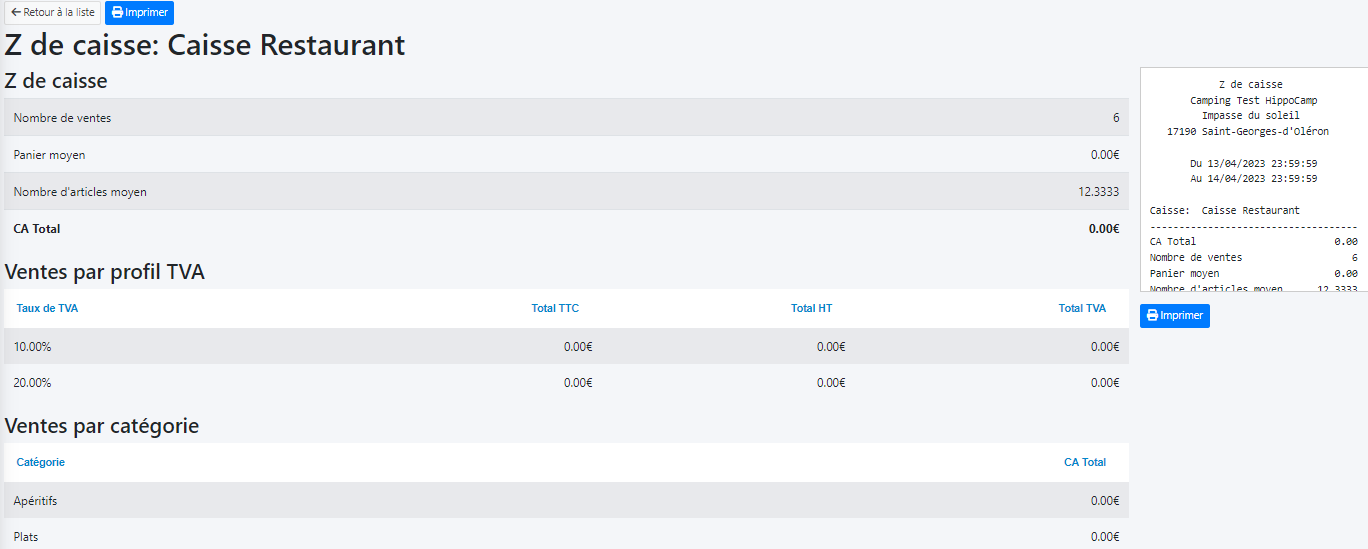 Le rapport Z de caisse détaillé fournit une analyse granulaire des ventes quotidiennes de la caisse restaurant, incluant les ventes par produit et par vendeur. Cette section vous aidera à comprendre et à exploiter les données fournies par ce rapport.
