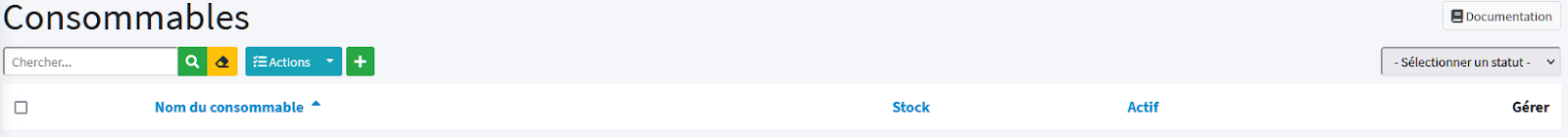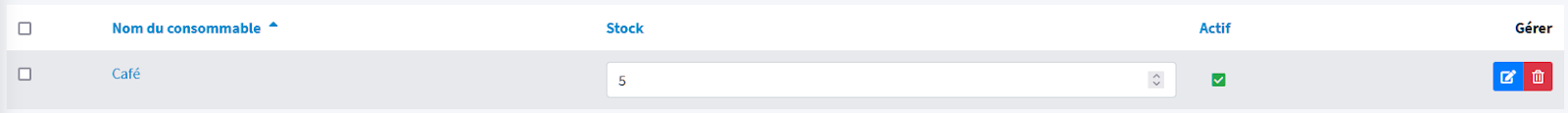 Une fois que vous avez validé la création de votre consommable vous arrivez sur ce tableau ci-dessous dans lequel vous retrouvez l’ensemble de vos consommables. A partir de cet écran vous pouvez facilement gérer le stock, l’actualiser, rendre un consommable actif ou non et gérer son paramétrage.