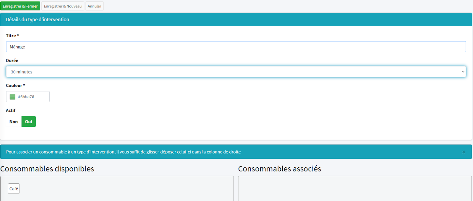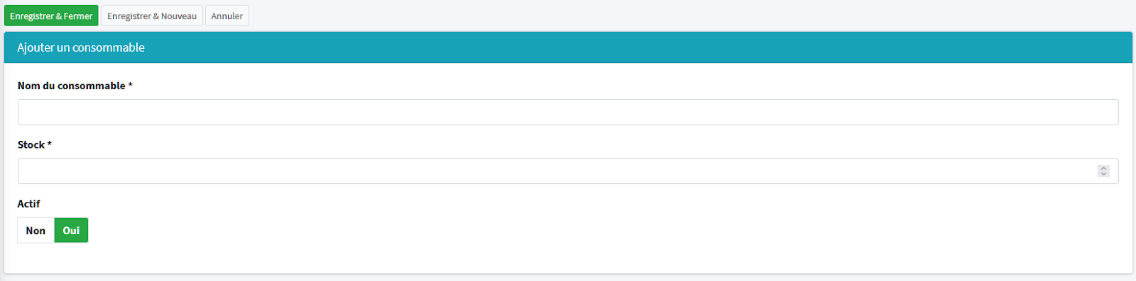 Actif : oui si le produit est toujours utilisé / non si le produit n’est plus utilisé donc n’apparaitra plus dans la liste des consommables disponibles