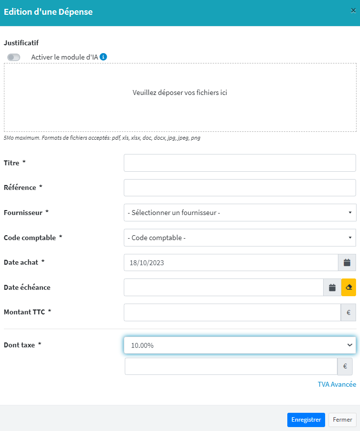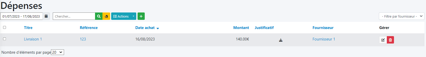 Cet écran vous permet de saisir une nouvelle dépense fournisseur et de consulter toutes les dépenses saisies.