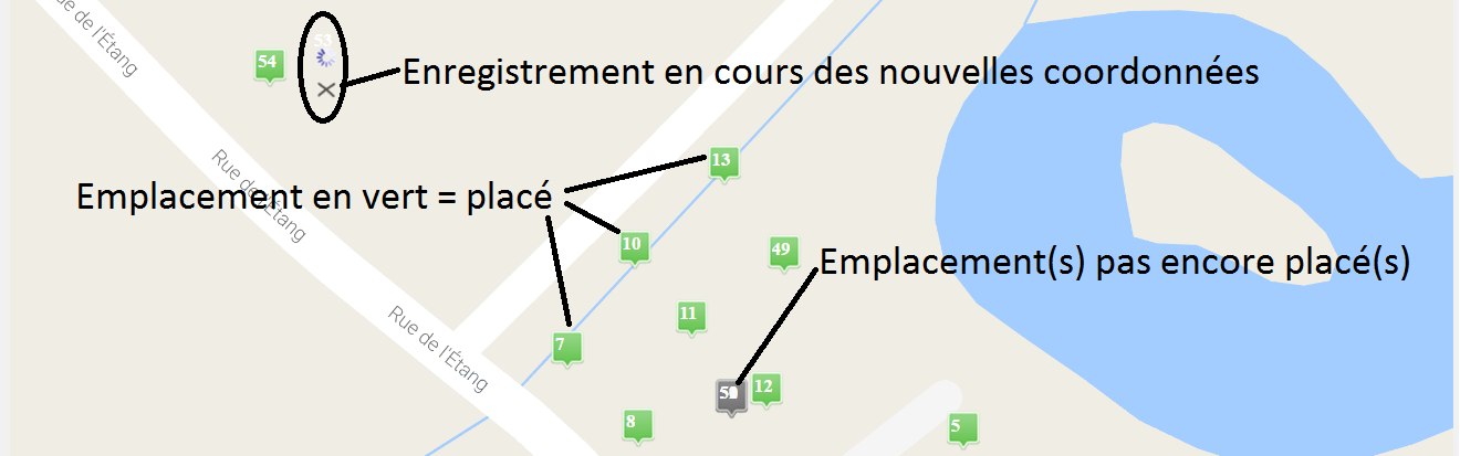 L’emplacement en cours de création est symbolisé par un marqueur rouge. Les marqueurs gris représentent les emplacements déjà créés.