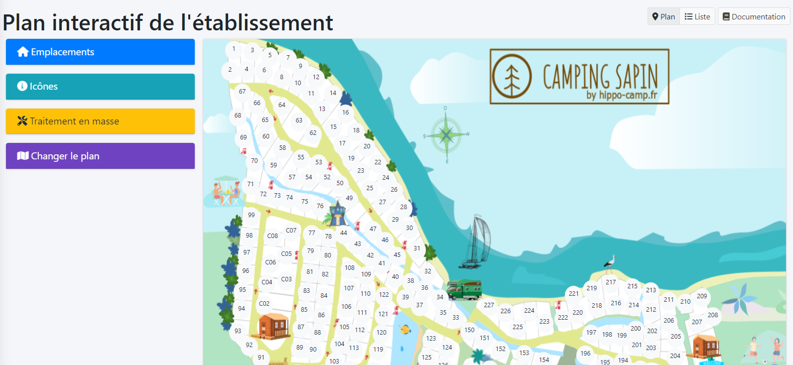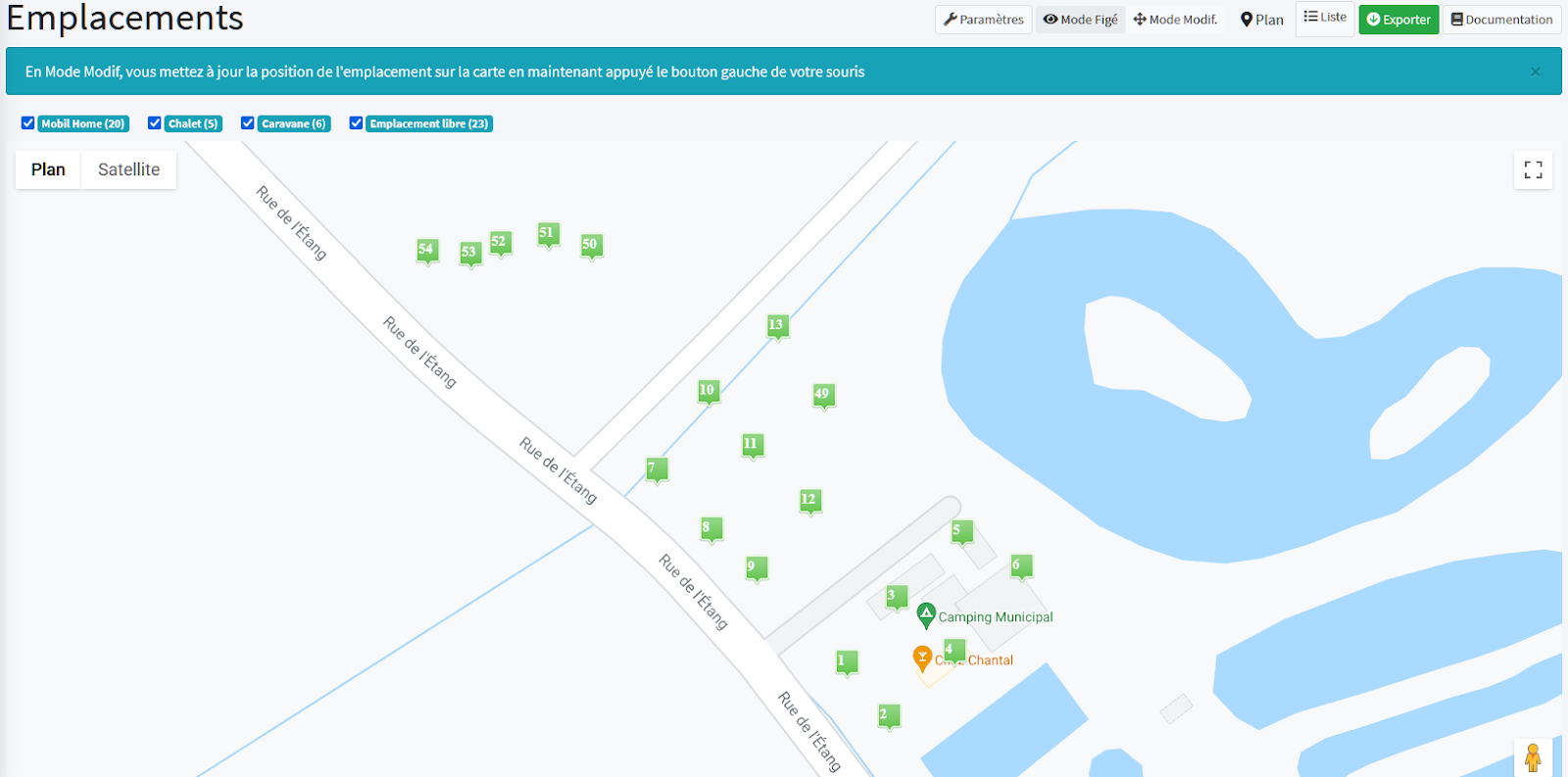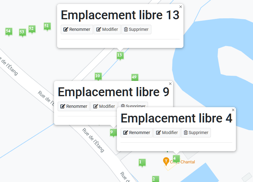 Lorsque vous validez la saisie, HippoCamp crée les emplacements et les place au centre géographique du camping. Il vous faut alors les déplacer géographiquement sur la carte.