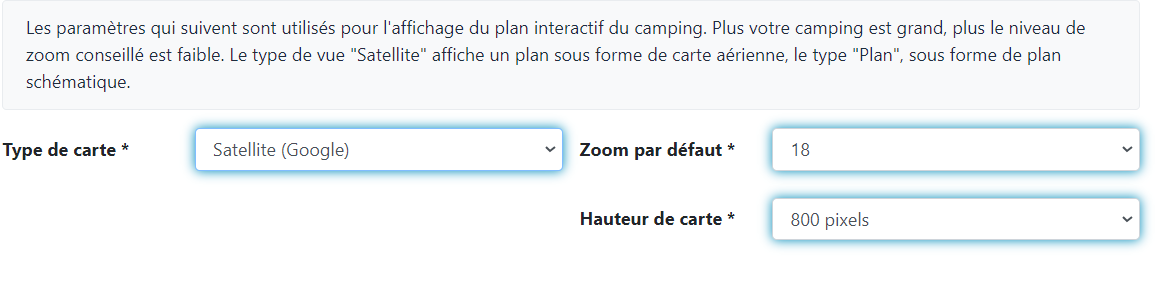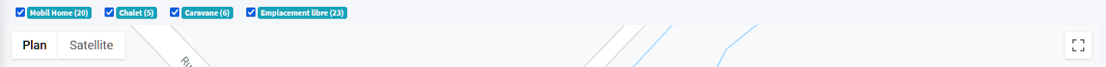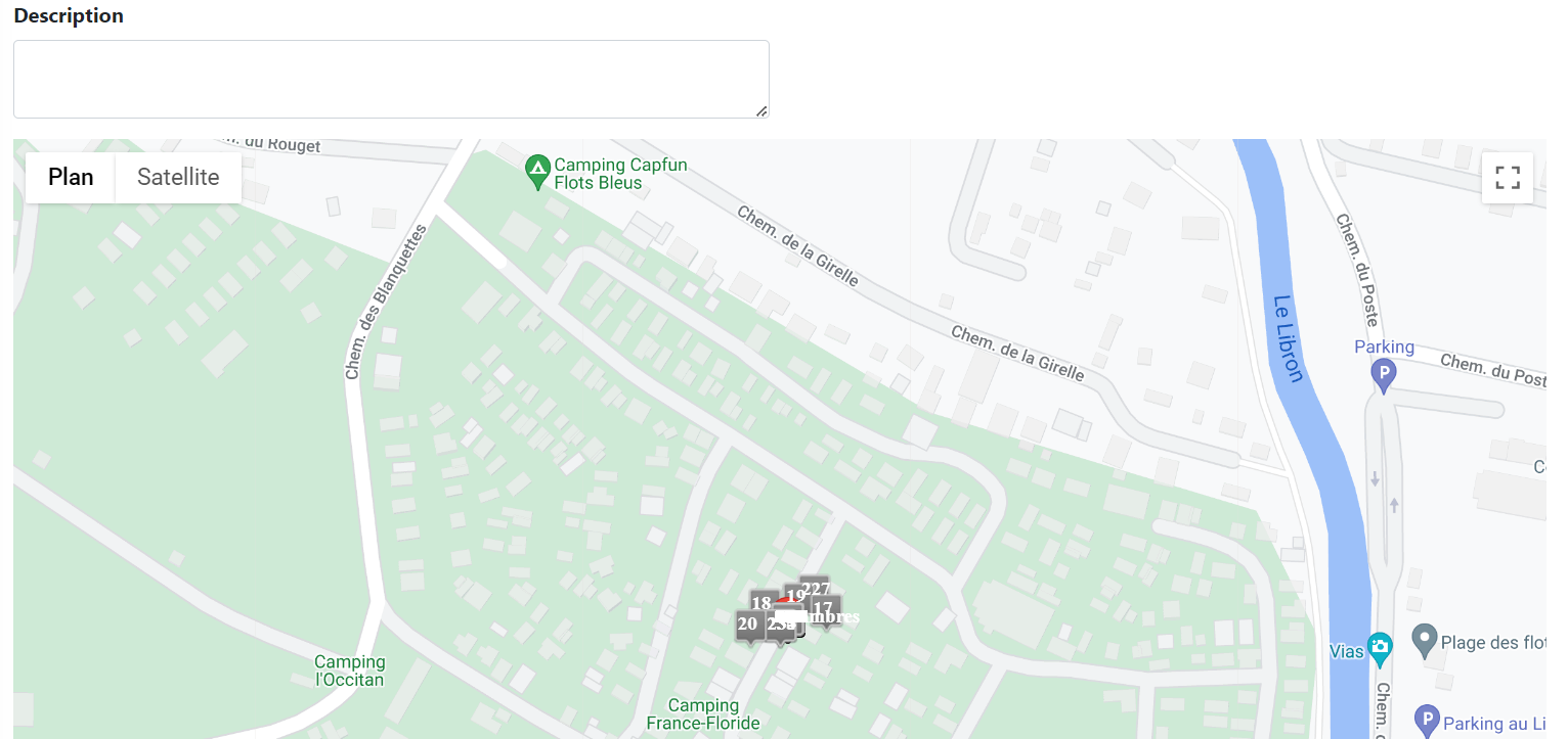 Par défaut, en mode Plan Google, le plan est centré selon les coordonnées définies dans l’écran Paramètres > Mon Camping (documentation ici).