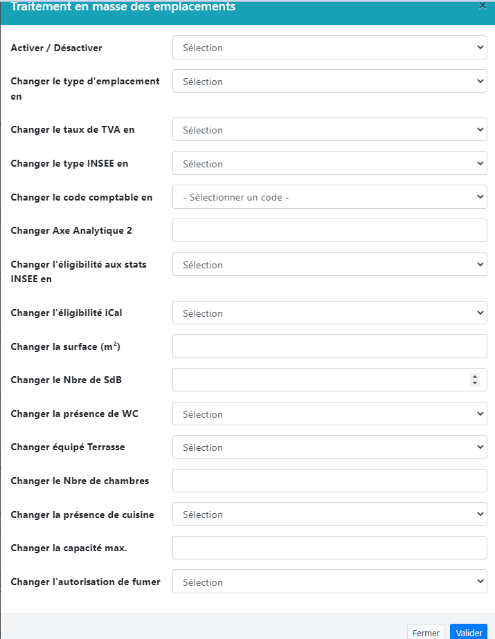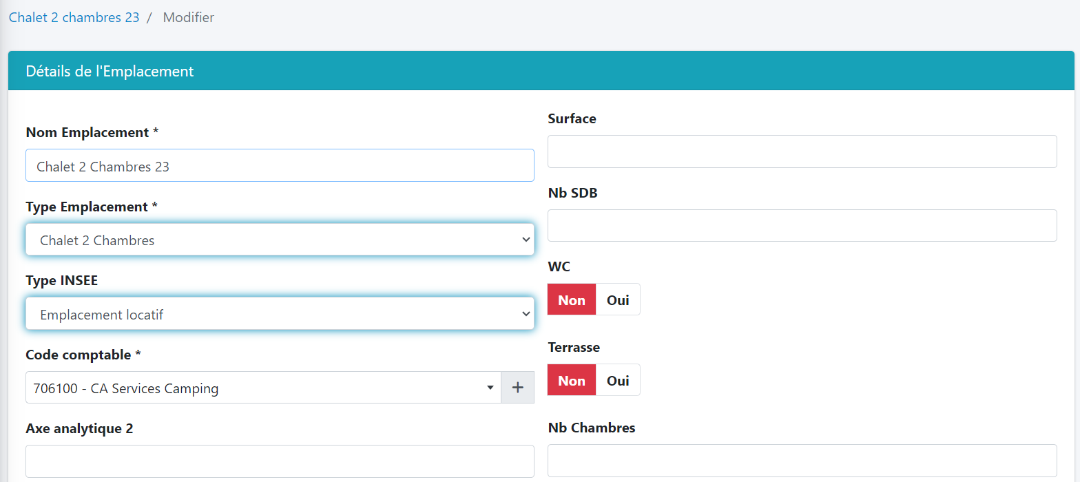 Astuce : lorsque vous changez le type d’emplacement, le logiciel renomme par la même occasion l’emplacement. En effet si le Bungalow 32 est changé en MH 2ch, le nom de l’emplacement devient MH 2ch 32