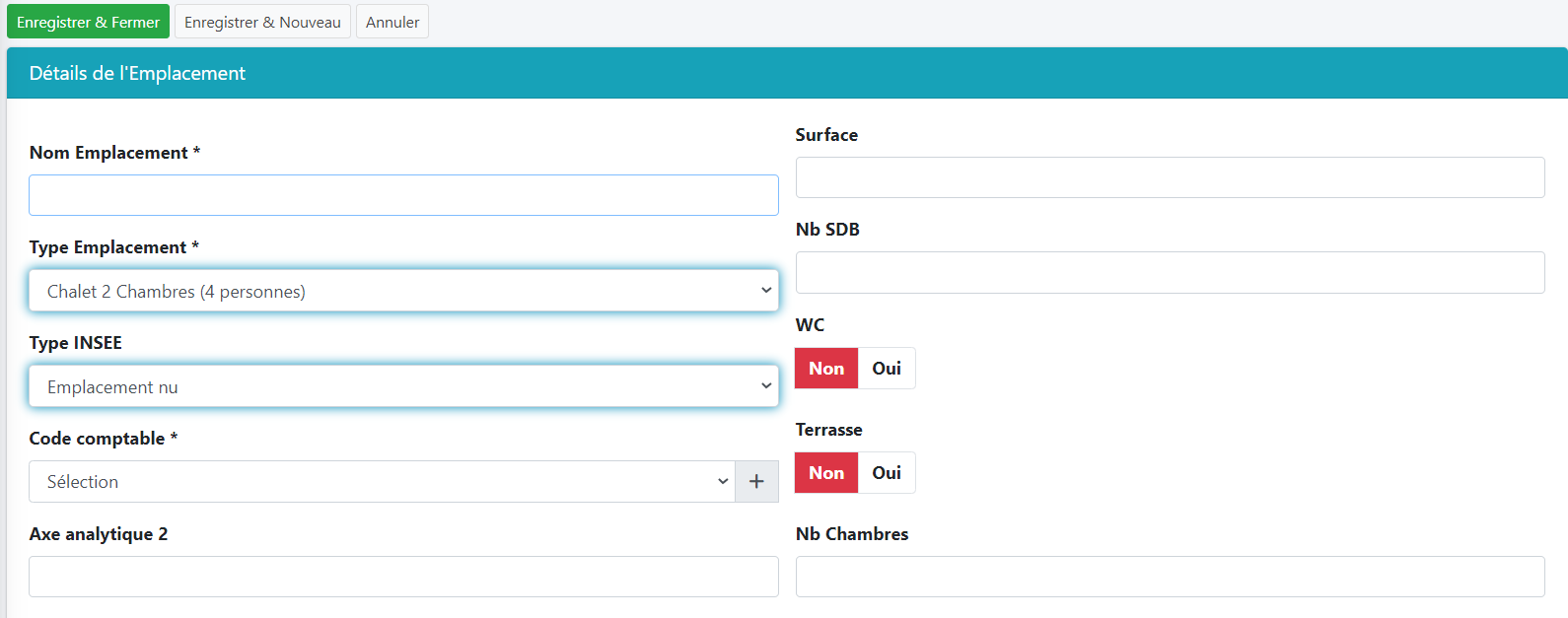 Dans HippoCamp, un emplacement est défini par son nom, son type d’emplacement, son type INSEE, son code comptable, ses coordonnées géographiques, son taux de TVA, le emplacement auquel il est rattaché ainsi que par son éligibilité aux interventions et son statut actif/inactif.