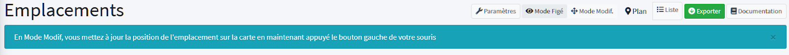 Quand la vue des emplacements est sous forme de liste, le bouton Exporter est affiché. En cliquant sur ce bouton, vous téléchargez un fichier compatible excel.
