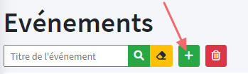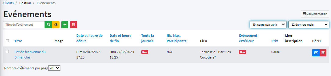 Vous retrouvez la liste de tous les évènements créés par vos soins. Chaque entête de colonne est ordonnable. Vous pouvez appliquer des filtres de recherche et créer, modifier, supprimer vos évènements.