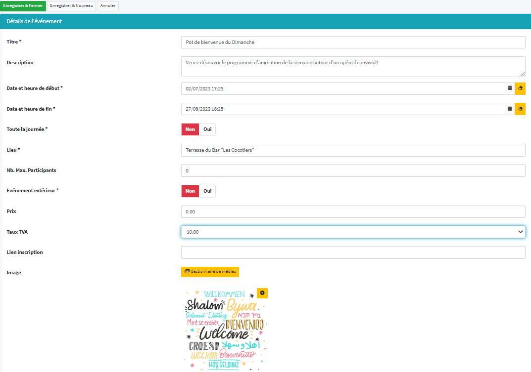 Cet écran permet de répertorier les événements et animations qui ont lieu dans l’établissement. Vos voyageurs peuvent consulter la liste des évènements durant leur séjour directement sur leur espace client.
