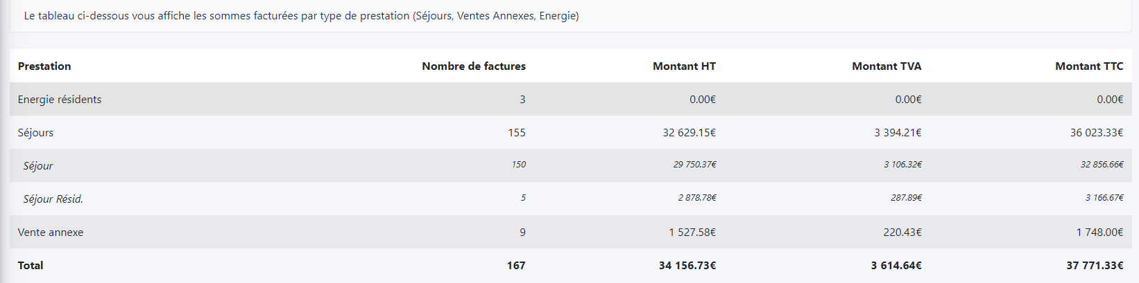 Prestation : Les différent type de prestations ( séjours, résidents, vente annexe )