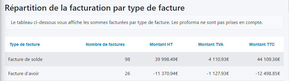HippoCamp vous affiche la répartition par type de facture, le nombre de facture et le montant HT.