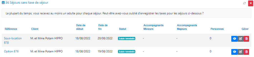 Les séjours n'ayant pas de supplément de type « taxe de séjour » sont affichés ici. Vous accédez au détail du séjour ou à son édition directe à l'aide des boutons situés dans la colonne « gérer ».