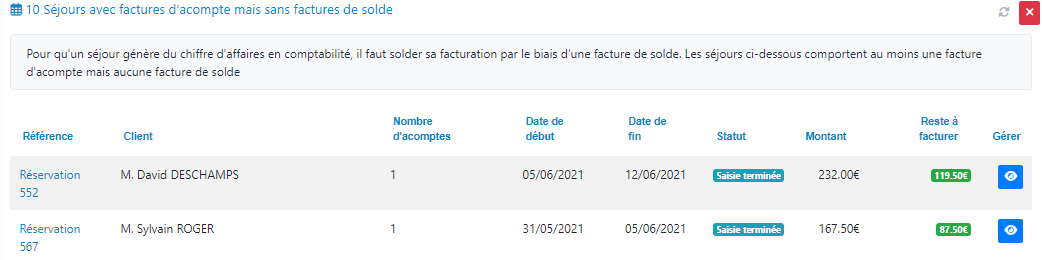 Comptablement, le chiffre d'affaires est réalisé à l'émission de la facture de solde. Il s'agit d'une différence notoire entre facture d'acompte et facture de solde. Ainsi, si des séjours sont facturés avec au moins un acompte et aucune facture de solde, votre chiffre d'affaires est faux.