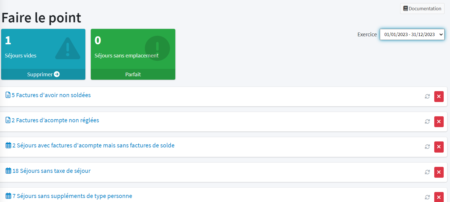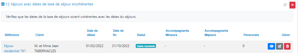 L'icône de la corbeille rouge de la colonne « gérer » vous permet d'ignorer cette anomalie pour purger la liste si un séjour ne devrait pas y être.