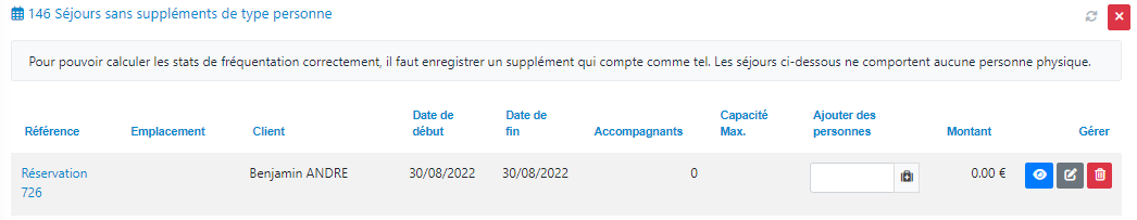 HippoCamp comptabilise le nombre de personnes au sein de chaque séjour à l'aide de l'attribut « Est une personne » défini pour chaque supplément. Les séjours qui ne comportent aucune personne sont listés ici.