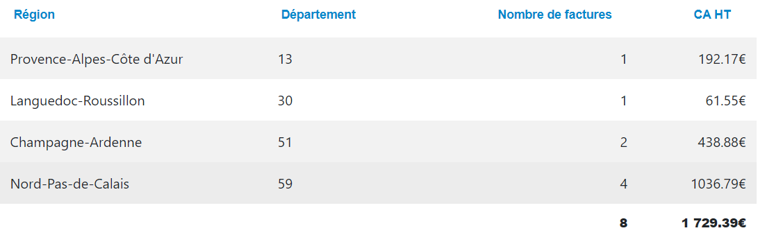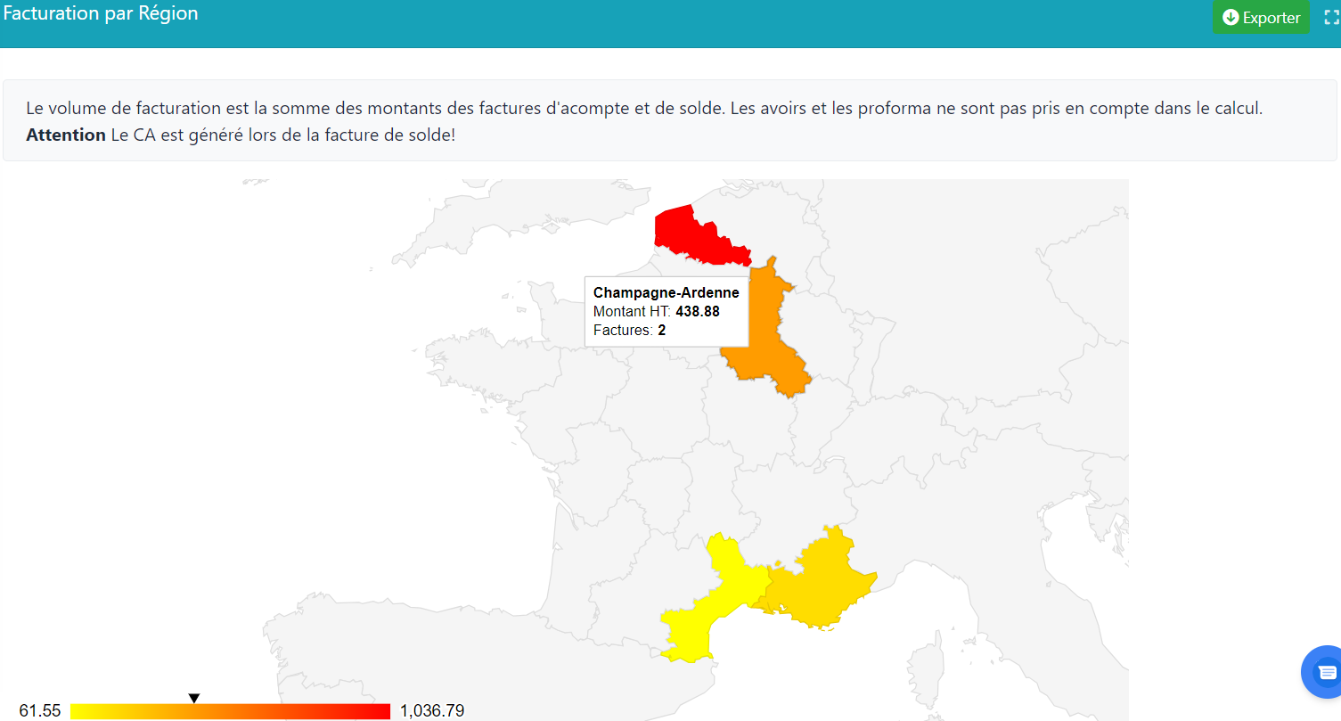 HippoCamp colorise les régions de France en fonction du volume de chiffre d’affaire réalisé sur la période. En déplaçant votre curseur sur la carte, des informations complémentaires sont affichées (facturation HT et nombre de factures)
