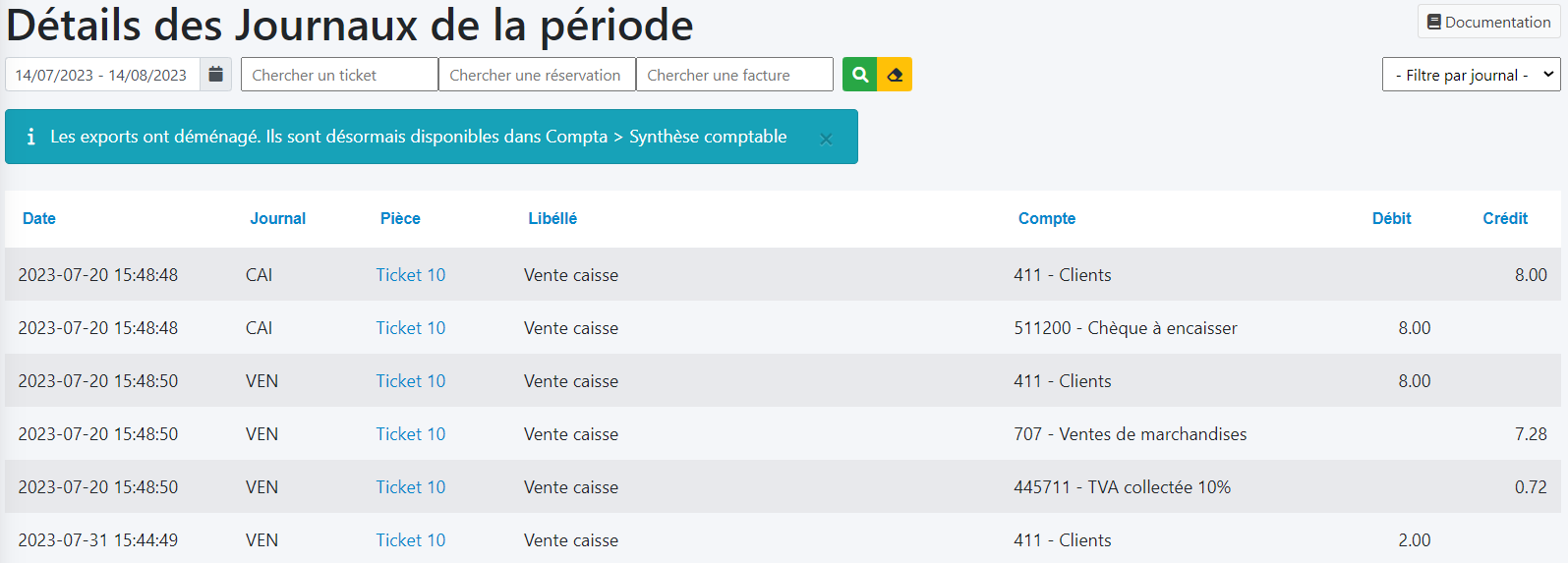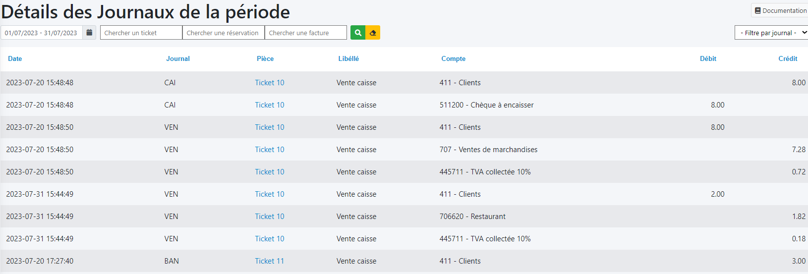Tous les filtres de recherche sont cumulatifs, c’est-à-dire que vous pouvez cumuler les critères de recherche. Exemple : « je recherche les écritures comptables du journal de Vente, générées en août de cette année portant sur le séjour 872 »