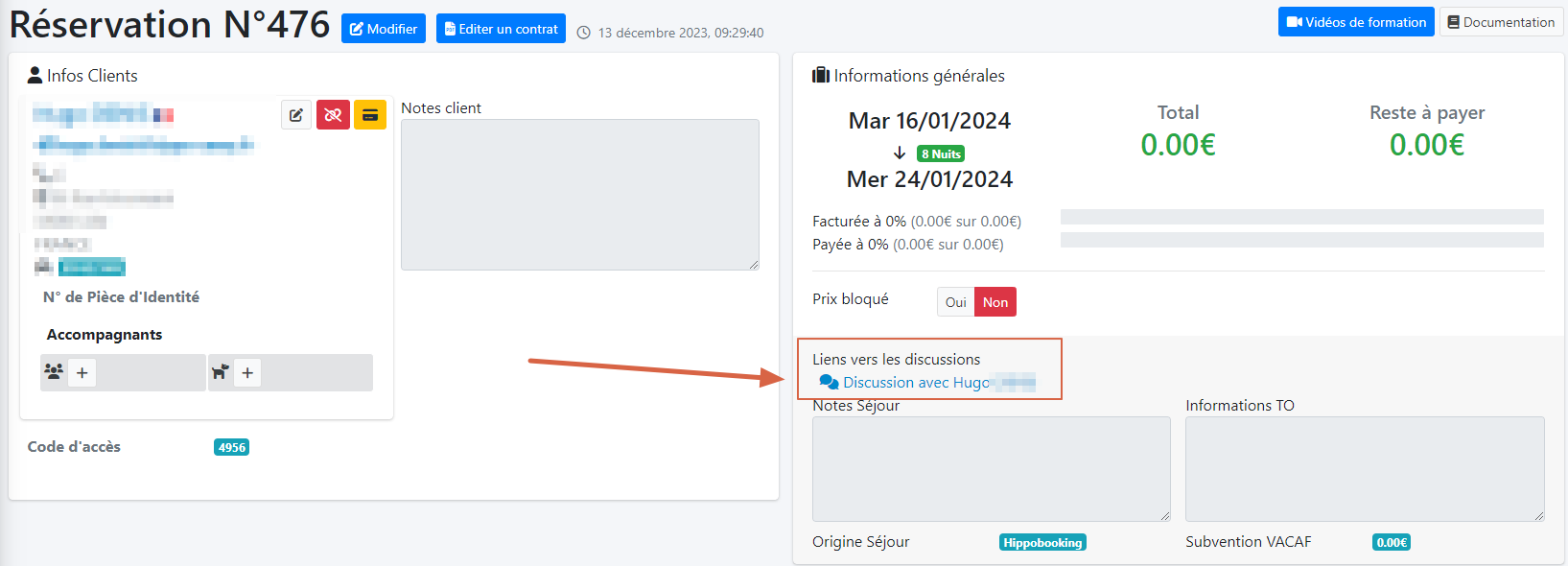 Afficher le séjourassocié à la conversation, utilisez les boutons situés en haut du panneau de conversation. Vous pouvez également cliquer sur le nom du client pour accéder à sa fiche client.
