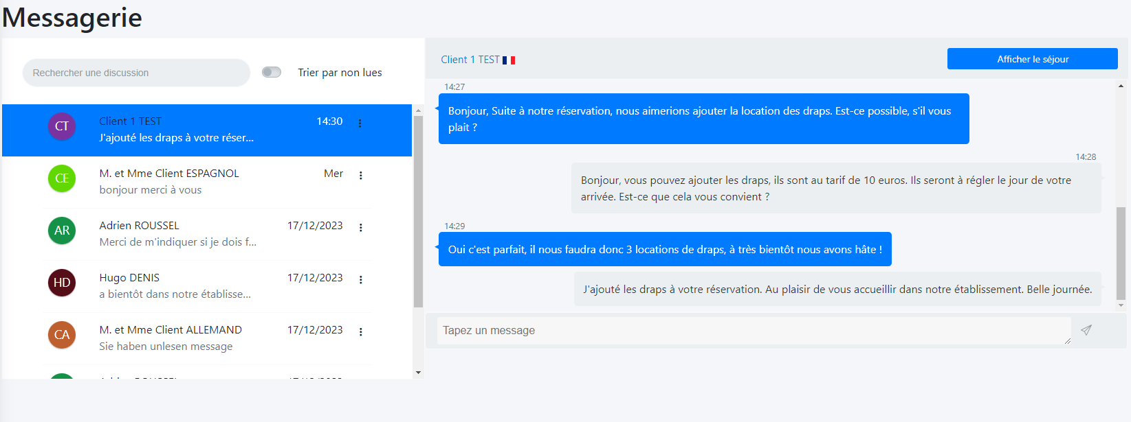 Comment y accéder : Deux manières sont possibles, soit par l'icône de la Messagerie présente sur la barre de recherche rapide, soit depuis un séjour si une conversation a été amorcée avec un client.