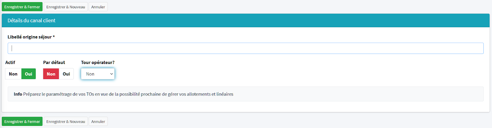 Le formulaire de création d’une origine séjour est très simple. Vous n’avez qu’à remplir le les principaux champs des détails du canal client.