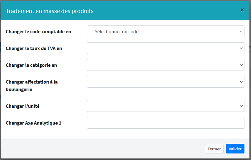 Il est possible d’effectuer des opérations en masse sur les produits. Vous pouvez sélectionner plusieurs produits ou tous afin de leur attribuer un champ commun : le code comptable, le taux de TVA et/ou la catégorie.