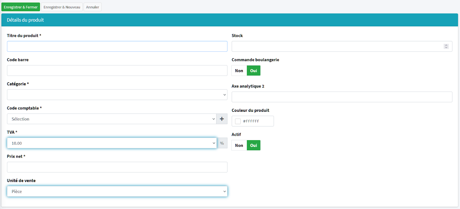 Pour valider la création clique sur Enregistrer & Fermer pour revenir à l’écran précédent ou Enregistrer & Nouveau pour continuer de créer de nouveau produit par la suite.