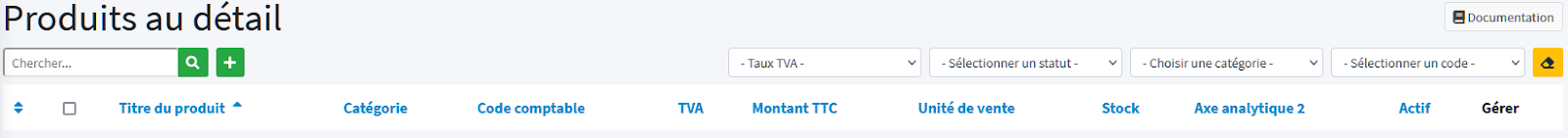 Une fois de retour sur la liste des produits paramétrés dans le logiciel vous avez la possibilité de rendre un produit actif ou non, et de saisir le stock à partir de cet écran.