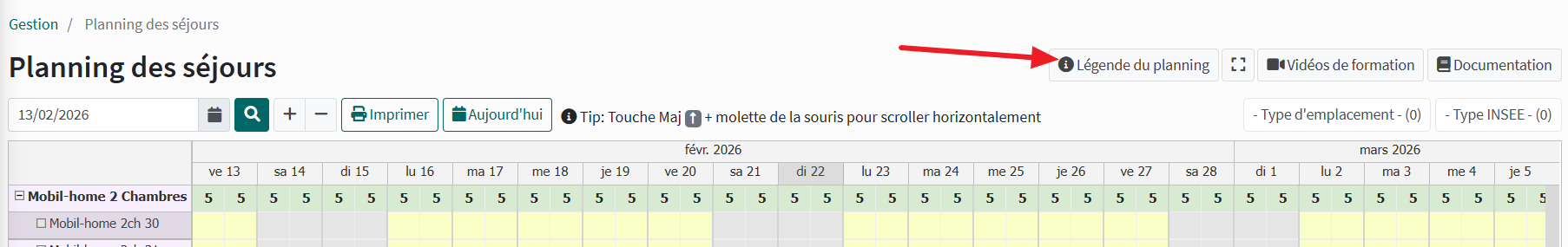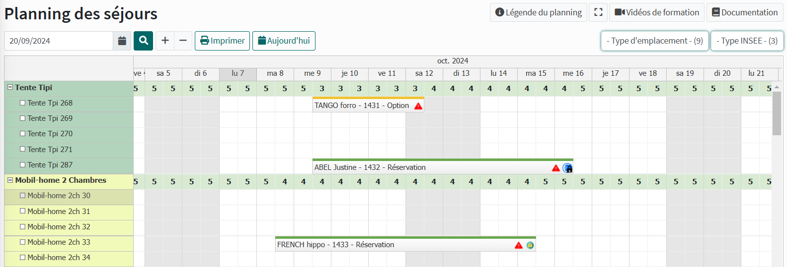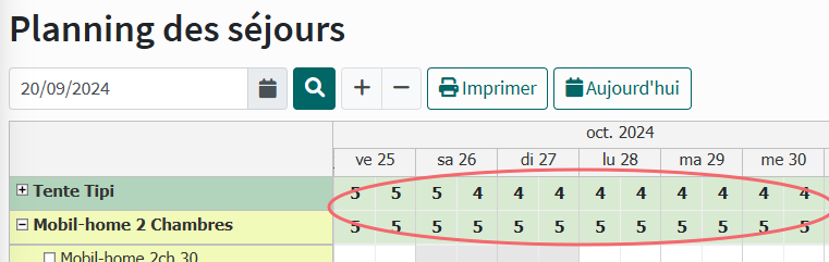Le planning des séjours indique le nombre total des disponibilités pour chaque type d'emplacements.