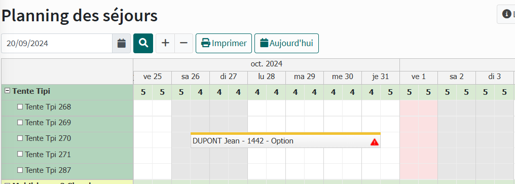 Une icône « triangle rouge » est affichée quand le séjour n'est pas totalement payé.
