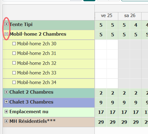 Les types d'emplacements comportent une petite icône « + » ou « - » qui permet d'afficher ou de cacher les emplacements du type en question.