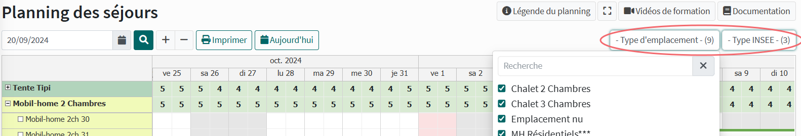 Un filtre de recherche par type d'emplacements permet de retrouver rapidement l'hébergement souhaité afin de repérer les disponibilités et les séjours occupés.