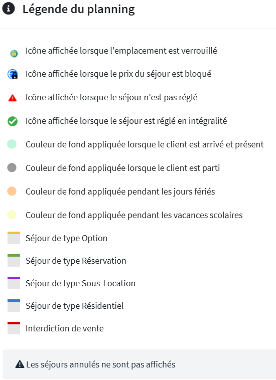 D'autres icônes et codes couleurs vous apportent des informations sur les séjours pour en faciliter la lecture.