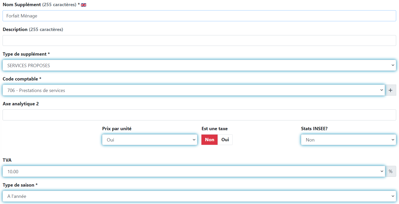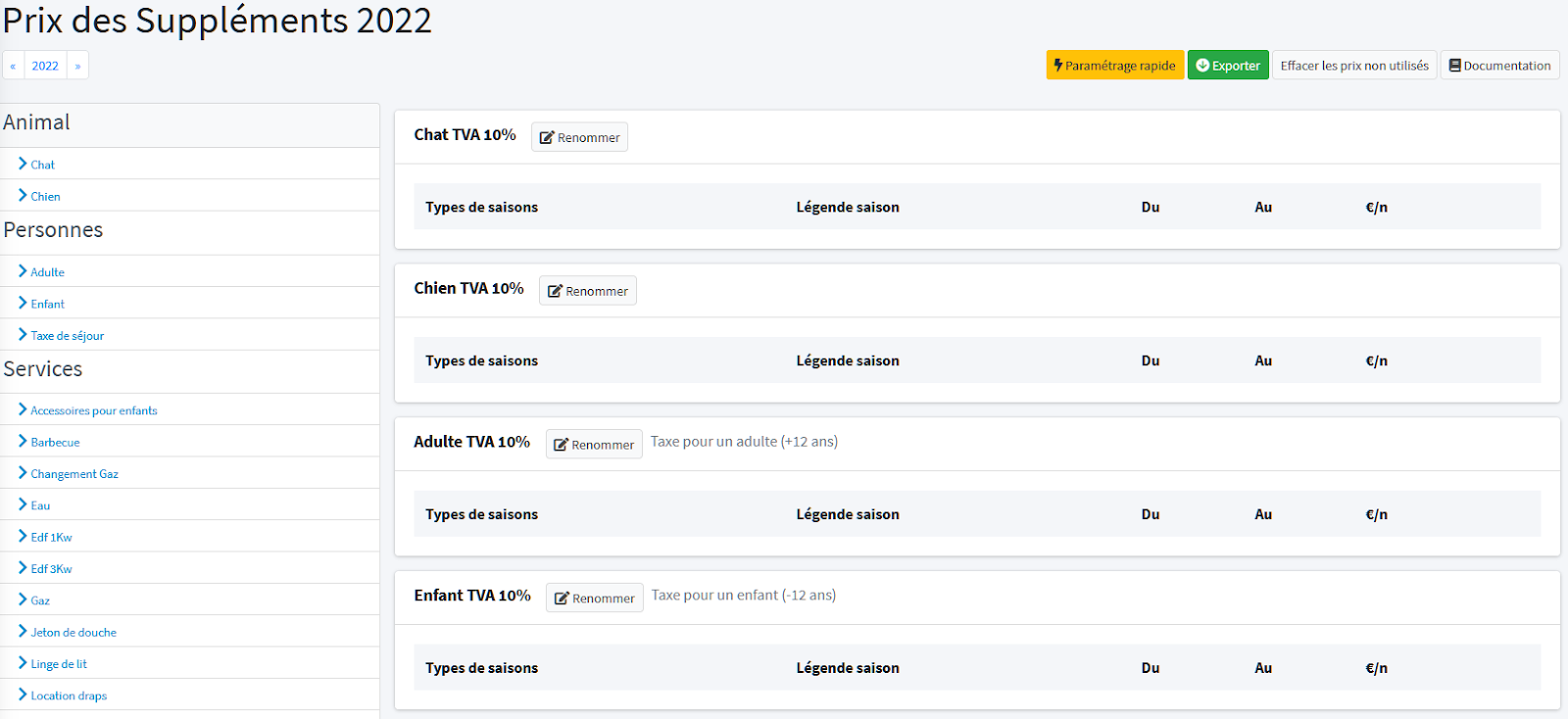 Cet écran vous permet de définir le tarif de vos suppléments. Pour pouvoir définir un tarif, vous avez au préalable renseigné les écrans Paramètres > TVA, Paramètres > Types de Saisons, Paramètres > Saisons, Paramètres > Types de Suppléments et Paramètres > Suppléments