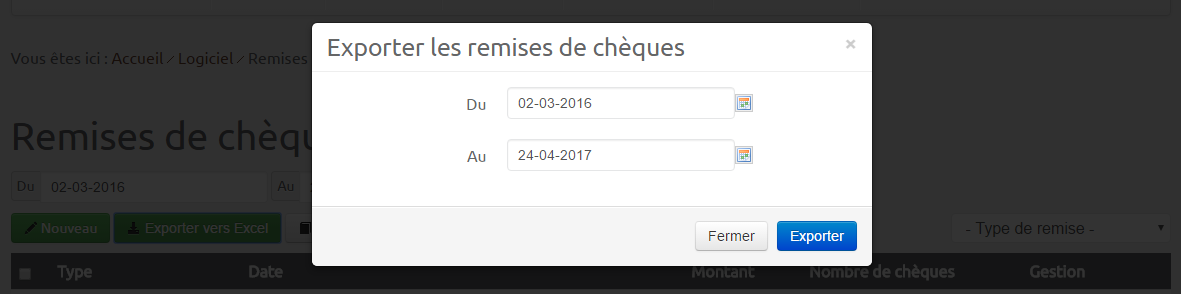 Vous exportez les remises de chèques au format excel en cliquant sur le bouton intitulé