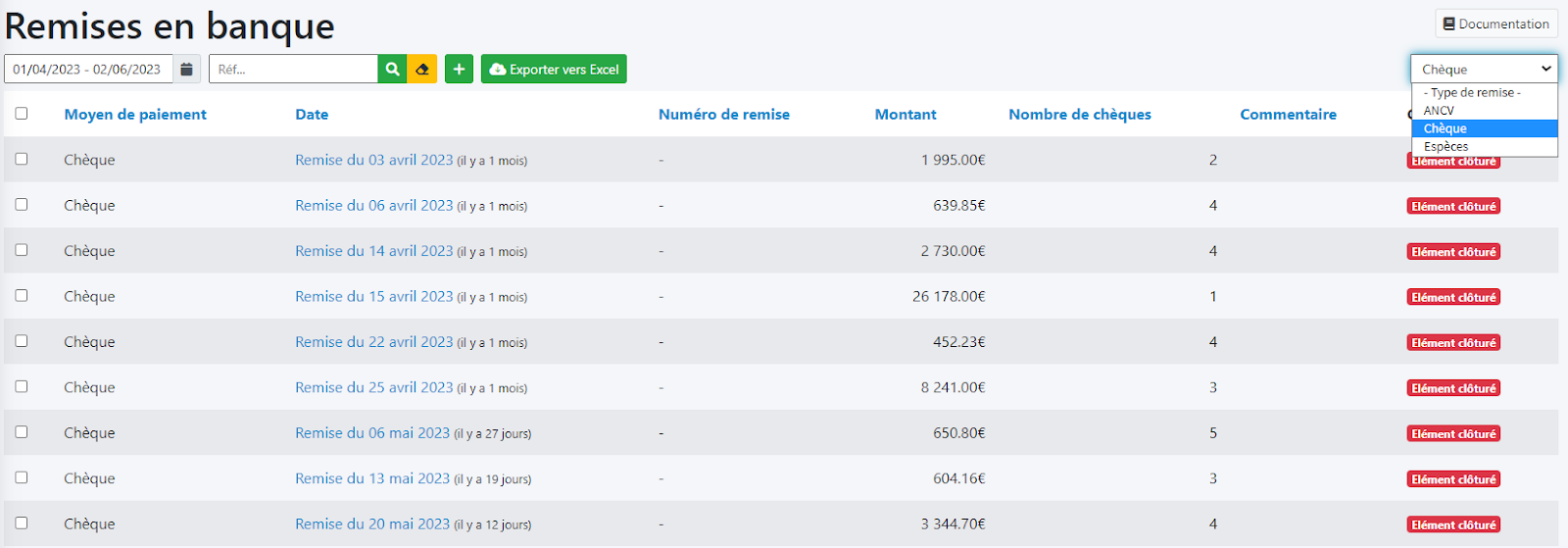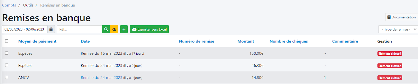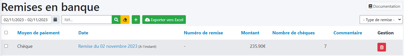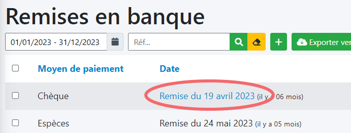 Date : date de la remise en banque avec lien vers le détail de la remise,