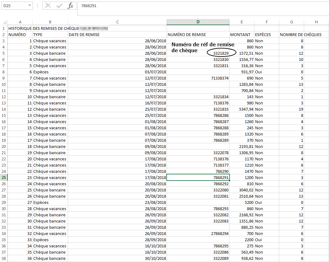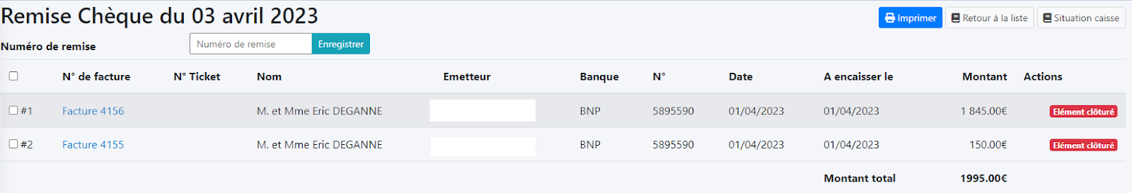 Le détail de la remise vous liste dans un tableau les différents chèques qui l’a compose :