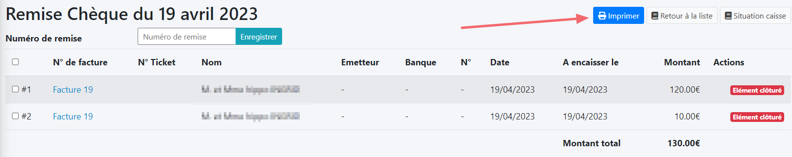 Vous pouvez imprimer le détail de la remise en cliquant sur le bouton « Imprimer » et retrouvez le détail des chèques faisant partie de la remise.