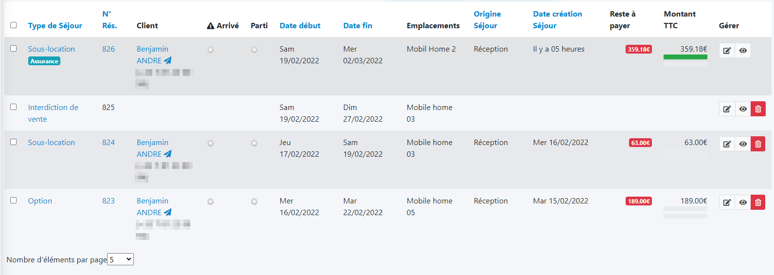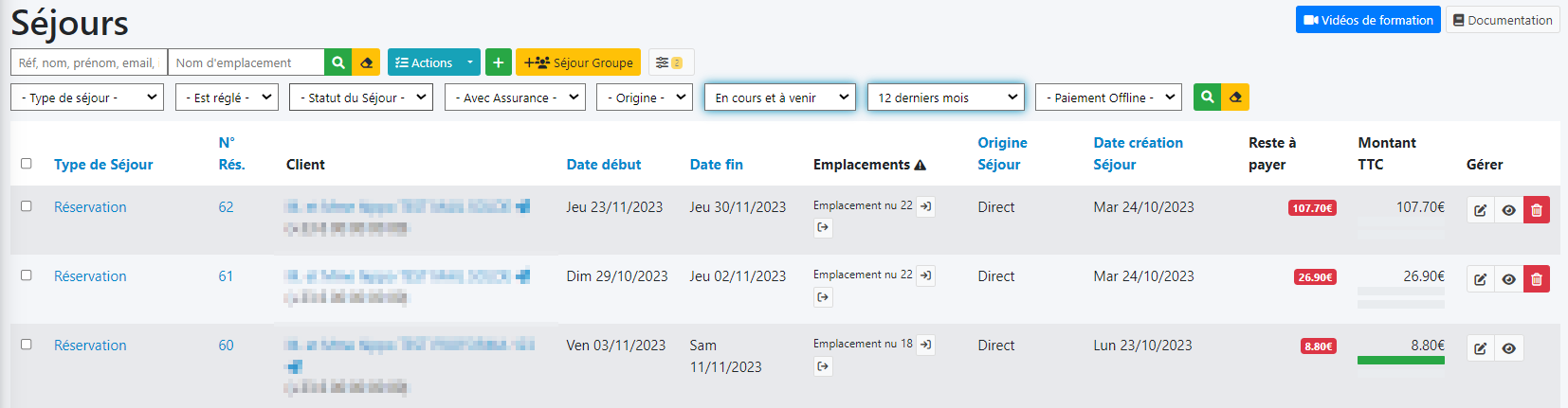Client : Les noms et prénoms du ou des clients associés au séjour. Un clic sur le nom du client vous amène en mode consultation de la fiche Client,