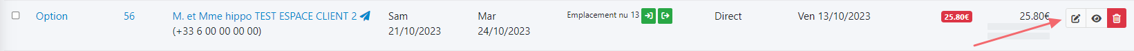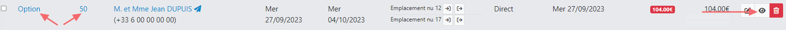 Vous accédez à la fiche séjour en cliquant sur la référence du séjour ou sur l'icône en forme d'œil.