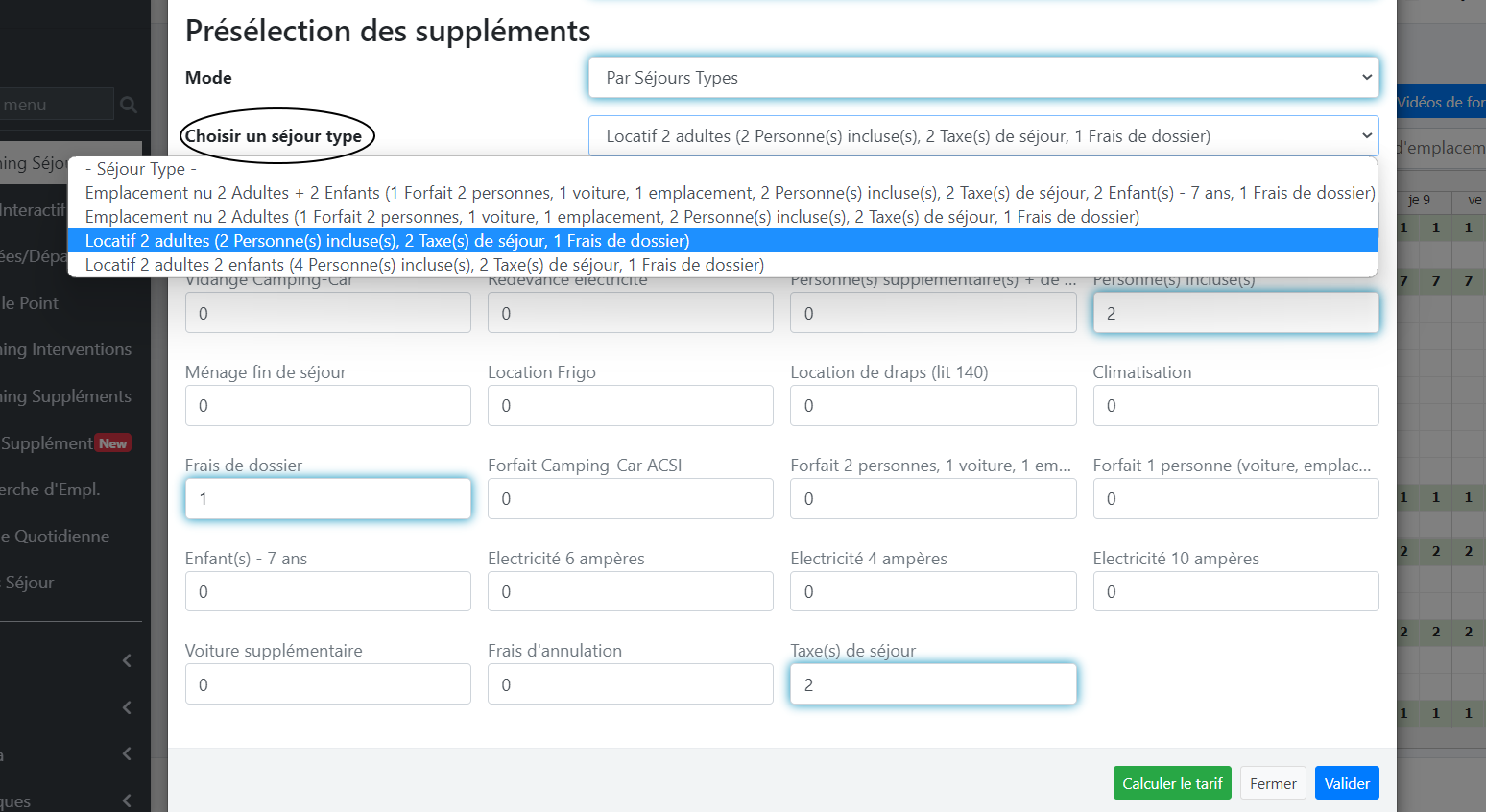 Pour utiliser votre séjour type, il suffit de le sélectionner dans la liste déroulante entourée ci-dessus. HippoCamp va alors remplir automatiquement les suppléments.