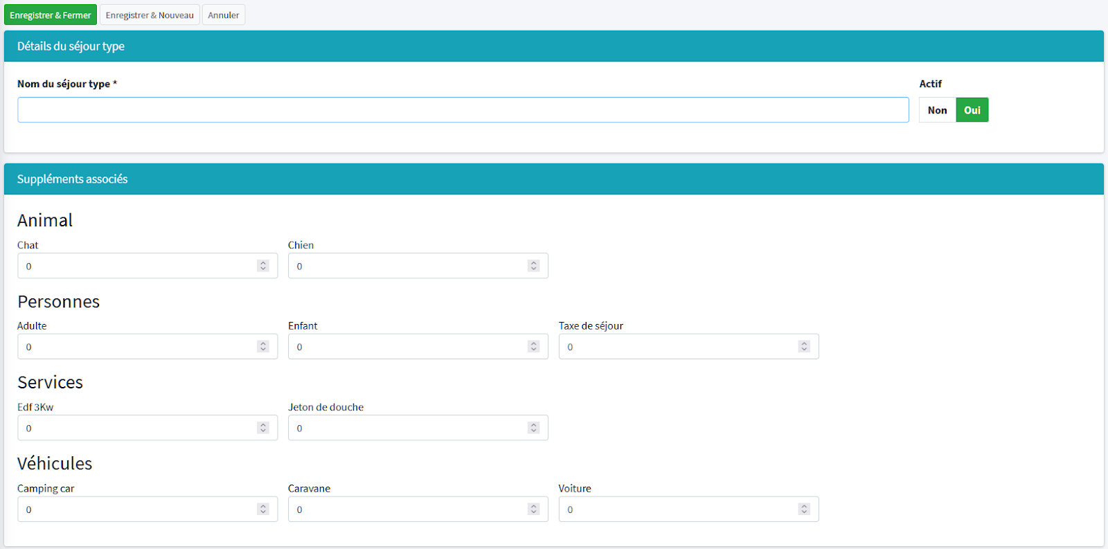 En cliquant sur le bouton « Nouveau » de l’écran précédent, vous arrivez sur le formulaire de création de votre séjour type.