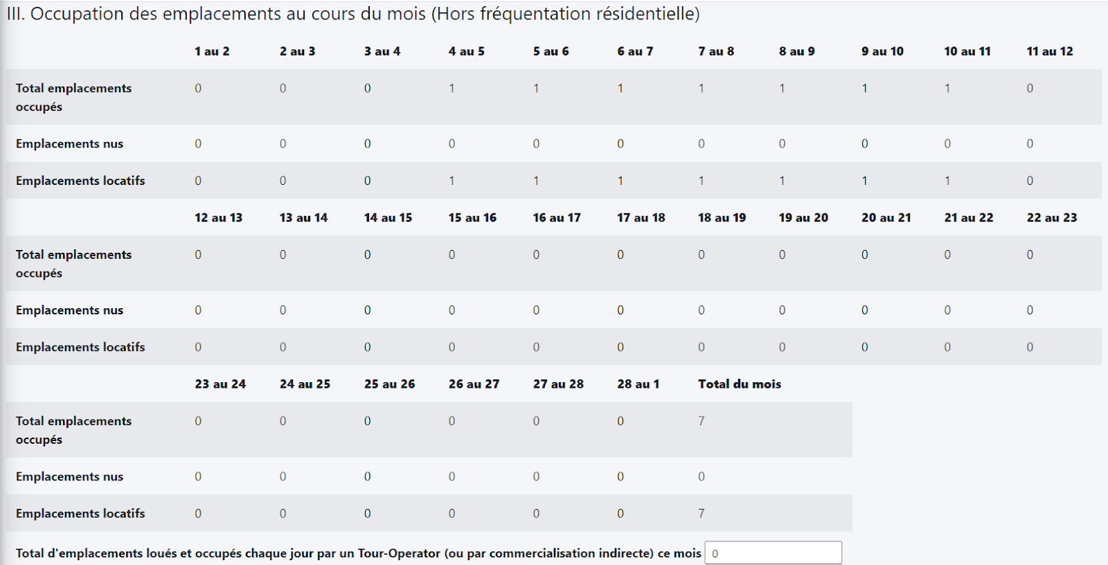 Pour alimenter ce tableau, le logiciel comptabilise le nombre d’emplacements occupés nuitée par nuitée, par type (nus et locatifs), en excluant les emplacements résidentiels. Seuls les séjours de type Passage et Sous location sont pris en compte.