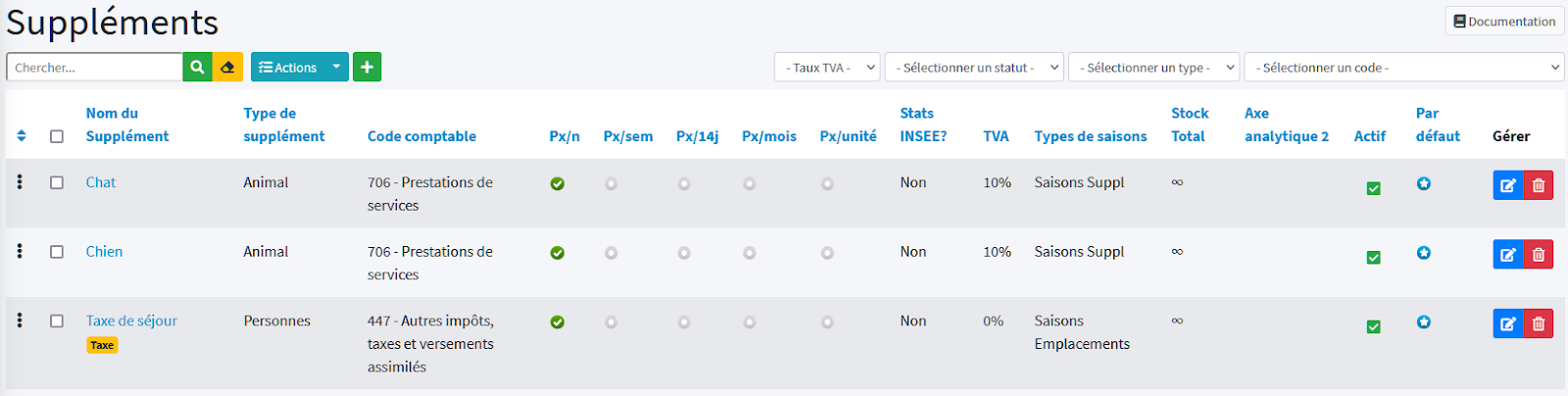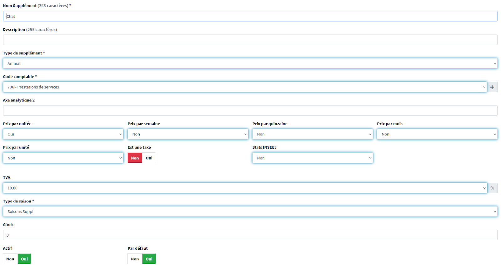 Dans HippoCamp, un supplément est principalement défini par son nom, son type, son code comptable, son taux de TVA, ses différents types de tarifs et son statut actif/inactif.
